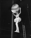 Evelyn Kaps, 17-year-old tight wire walker, thrilled an overflow crowd at the Gainsville Community Circus performance for Convair employees in Will Rogers Memorial Coliseum. Evelyn Kaps walks on a tight wire holding an umbrella with her right hand.