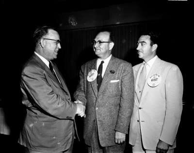 Curtis Taulbee, left, Governor of the tenth District, Advertising Federation of America, discusses Fort Worth United Fund drive with William Shirley, center, of San Angelo, and Swain Rodgers of Lubbock.