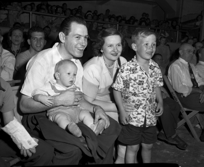 Mr. and Mrs. Charles Schneider, 3145 Sandage, and their sons, Robert, 9 months, and Charles Schneider Jr., 5, watch the Gainesville Community Circus performance in Will Rogers Coliseum for Conver employs and families.