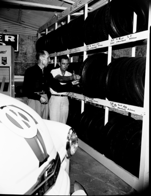 A. D. Wear, left, owner, and Harry Douglass, manager, of the new O. K. Rubber Welders number two, examine part of the stock in the shop having its grand opening Thursday, July 16.