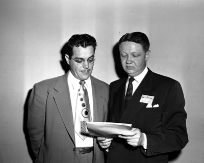 Dr. Sherman Sparks of Rockwall, left, and Dr Robert J. Brune, Corpus Christi, scan a report on atomic medicine they will make at the convention of the Texas Osteopathic Association at Hotel Texas. The two attended an Atomic Energy Commission school in California.