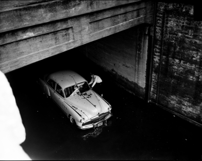 A combination of wind, hail, and rain hit Fort Worth Thursday afternoon, July 16 and caused some damage. Traffic Officer R. E. Lindsey chats with G. A. Bertman of 3101 Lipscomb while awaiting a wrecker to pull the stalled car from the water clogging Jennings Avenue underpass.