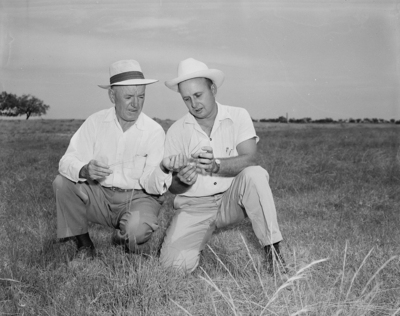 Loyd Herring, left, Runnels County rancher, looks at sideoats grama grass that is increasing in quantity and quality in Herring's pastures under a deferred grazing program. The man at right is unidentified.