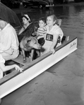 A flash flood caused by the tremendous cloudburst Friday July 17 sent waters pouring into the Linwood Addition of Fort Worth. Clutching a folder of valuable papers and her grandson, Gregory Sanchez, Mrs. Francis Sandoval of 2724 Weisenberger is evacuated by boat from her home. Mrs. Willie Sandoval, left, and dog and seven children also were taken from the flooded house.