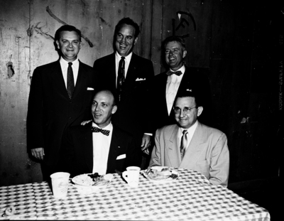 Key figures in a mortgage financing panel discussion at Pioneer Palace were, standing left to right, John F. Austin of Houston, John E. Mangrum of Dallas and Maurice Harkins, Fort Worth, moderator; seated, left to right, R. B. Billings, president of the Home Builders Association, and R. G. Hughes of Pampa, president-elect of the National Association of Home Builders.