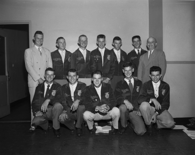 Ten blue-jacketed young men were making the rounds of Fort Worth Monday, rubbernecking and politicking. They are new area vice presidents of Texas Future Farmers, who will be followed by 3,000 more Future Farmers of America members. From left to right, back row, they are, R. B. Thomas, Darrel Rogers of Lamesa, Raymond Hinders of Canyon, Jon Hagler of LaGrange, Kenneth (Rusty) Reynolds of Pittsburg and Taylor. In front row they are, Hugh Spring of Luling, John Posz of Alamo, Bobby Beathard of Kirbyville, Damon Campbell of Hamilton and Ardis Barnes of Commerce.