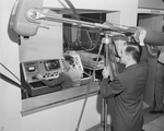 Technicians are shown preparing equipment which will be used in the first colored televising of an operation in the Southwest, at a medical convention in Fort Worth. On the left, Hugh G. Lynch is shown at the console control board. Cameraman Thomas A. Broderick stands to the right. The showing would be closed circuit, viewable for doctors only. Published in the morning edition, April 30, 1950.