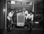 Adding a rustic touch to the lobby of Hotel Texas Tuesday was this tractor which Texas Future Farmers rolled into the lobby for a convention exhibit. Shown pushing are, left to right, Ralph Bachmayer of Taylor, Jon Hagler of LaGrange, Bennie Hamilton of Nacogdoches and Oran Little of Schulenberg. Convention starts Wednesday morning.