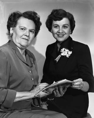 Mrs. C. T. Morehead, president of the "Penelope Club" (left), sits next to Mrs. John Paul Scott, program director of the club. The two women planned the club's Music Day tea gathering at the Women's Club. Published in the evening addition, May 2, 1950.