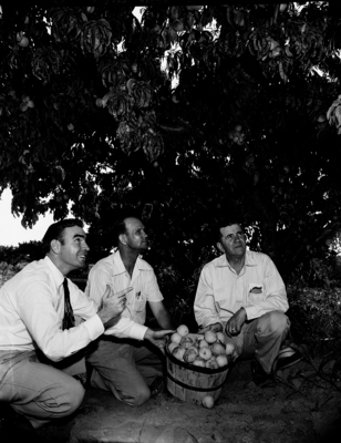 Parker County's peach crop occupied the center of the fruit and produce marketing stage Wednesday at Weatherford. Pictured left to right are Mayor Jim Wright Jr., J. W. Foster Jr. and Alvah Allen, admiring a tree loaded with peaches. Published in the Fort Worth Star-Telegram morning edition, July 23, 1953.