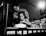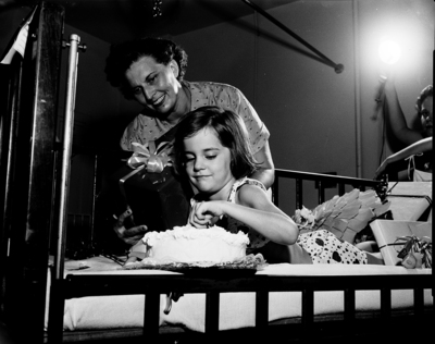 Mrs. W. L. Dwyer and Judy Ann Dwyer. Clipping reads: "Girl Polio Patient, 5, Given Party By Proxy--Television. Five-year-old Judy Ann Dwyer had a birthday party by proxy Thursday [July 23, 1953]. Judy Ann, daughter of Mr. and Mrs. W. L. Dwyer of Cleburne, is convalescing from polio at City-County Hospital. Hospital rules bar visitors from the polio ward. But Judy's twin brother and sister, John Allen and Joan, 8, and another sister, Janet, 7, found a way around that one. They appeared on a WBAP-TV show (Kiddie's Playhouse) Thursday afternoon to sing the patient a happy birthday. Judy's mother brought gifts and a cake to the ward. The children later appeared below Judy's window to reaffirm their wishes... Also at the celebration was Judy's grandmother, Mrs. C. W. Sullivan of Weatherford." Published in the Fort Worth Star-Telegram morning edition, July 24, 1953.