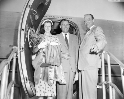 Ben and Valerie Hogan step from airliner at Amon Carter Field into a heart-warming welcome from a host of relatives and friends who were on hand to congratulate the famous golfing team on Ben's victory in the British Open at Carnoustie, Scotland.