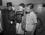 Allen James, left, and Dale Doan, of Merkel Texas are shown looking at an engraving camera during their tour of the Star-Telegram. The two young men came to Fort Worth for the state convention of the Texas Vocational-Industrial Clubs. Published in the morning edition, April 29, 1950.