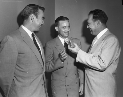Fred Hervey of El Paso, right, mayor of a city that has plenty of water, offers a drink to Clovis D. Mann of Wichita Falls, which has water rationing. Jim Wright, mayor of Weatherford, looks on. He is president of the League of Texas Municipalities whose executive committee met here Friday.