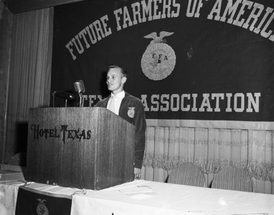 Jerry Brocke at Future Farmers of America convention. Brocke is standing at a podium.