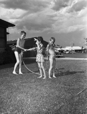 Higgins children, Pat, Ann and Mike Higgins. The children are playing with a water hose.