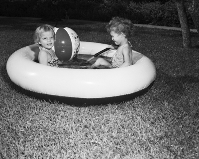 Pamela Prideaux and Dayann Liebman in wading pool. There is a beach ball in the pool too.