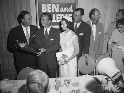 Mayor Pro Tem Mansfield M. McKnight, left, who was a golf companion of Ben Hogan's when the two were youths, presents Ben and Valerie Hogan with a framed proclamation declaring Monday 'Ben and Valerie Day.' Standing behind Ben is City Manager W. O. Jones. The presentation took place on the front steps of City Hall.