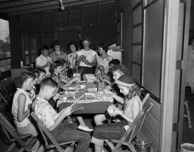Susy Bauer of Everman, and David Hilscher of Pantego, lead their group in basket weaving at the Tarrant County 4-H camp. There are many other children at the table with them.