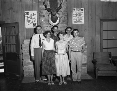 Award winners receive junior leadership certificates of merit. Back row, left to right, H. B. Dimukes, who presented the awards, Delbert Taylor, James Taylor. Front row, Ruth Barnes, Clovis Ann Watt, and Jerry Weatherby.