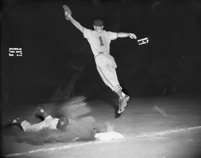Cats' Gale Wade dives into third base in fourth inning of Wednesday night game at La Grave Field as Beaumont Third Baseman Vern Benson leaps to haul in ball. Wade made it from first as Jim Baxes grounded out to Shortstop Walt Lammers.