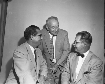 Doctor P. R. Russell, center, chairman of the Fort Worth Osteopathic Hospital's Board, discusses the institution's facilities with two representatives of the American Osteopathic Association's Bureau of Hospitals, Doctors R. D. McCullough, left, of Tulsa, and C. Lester Glasgow of Los Angeles, who went through the hospital Tuesday.