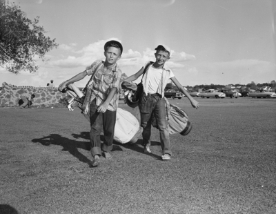 The City Junior golf tournament is old stuff to these campaigners, Larry Westfall, 13, left, and Roy Hill, 10, one, and two-year veterans of the meet, respectively. They are getting pointers while caddying in Glen Garden meet this week-end.