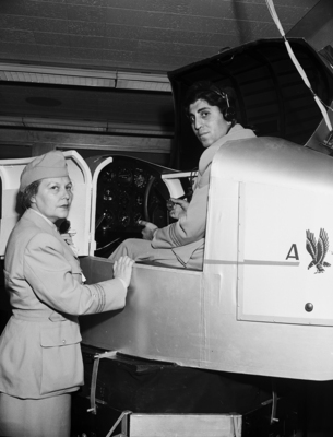 Major Sabiha Gokcen of the Turkish Air Force, head of a visiting group from her country, is shown as she and a Turkish pilot instructor candidate, Necdet Alcigir, inspected a Link trainer Thursday in the American Airlines hangar at Amon Carter Field.