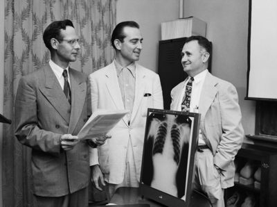 Three physicians attending a cardiovascular conference sponsored by the Fort Worth Heart Association study an electrocardiogram and an X-ray of a clinic patient. Left to right are Doctor John Marietta, Doctor Ed Etier Junior and Doctor E. R. Kyger Junior.