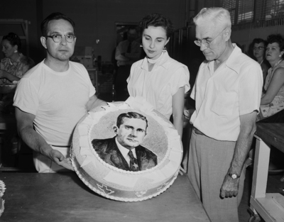 This sugar icing portrait of Governor Shivers was highlight of a course in cake decorating at Arlington State College this week. It was made by Emil Hilbert, left, Chicago instructor of the course, and students. Center is Mrs. Galen Bell of Marshall, who took the course, and at right is Roy W. Burdett, director of industrial training at Arlington State College.