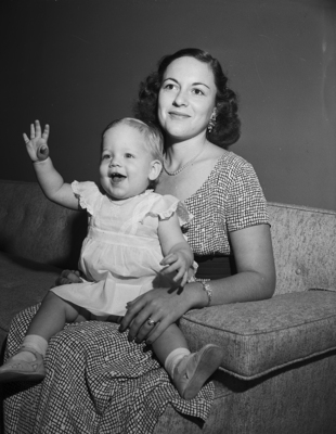 Mrs. Harold B. Sharpe and baby, Peggy Suzanne, and Sharpe have returned here to live at 3254 Medina after his two years in the Air Force. He was stationed at Williams Air Force Base, Chandler, Arizona, and at Ellington Air Force Base, Houston. Peggy is sitting on her mother's lap.