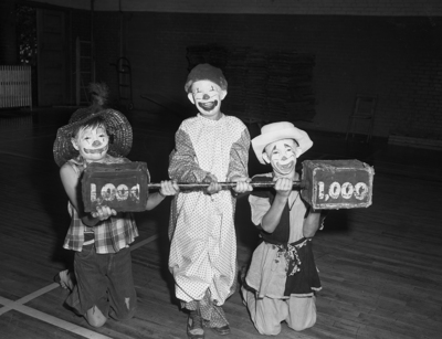 One thousand pounds is a lot of weight but the clowns in the recreation department circus prove here they can handle anything. These clowns, of the many in the circus cast, are, left to right, Mike Hickey of 3200 Lipscomb, Kenneth Allow of 1236 East Powell, and Joseph Turner of 2317 Yuma. The show, open to the public, was held at 8 p. m. August 14 at La Grave Field. The three clowns are holding a dumbbell labeled as 1,000 lbs.