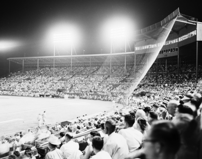 Here's portion of the 1953 record crowd- 7,807- which attended Cat game Friday night at La Grave Field for Merchants' Night Jamboree Fans also saw hour-long variety show.