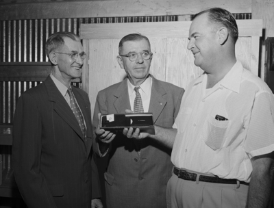 W. H. Melbern, right, division plant superintendent for Southwestern Bell Telephone Company here, presents service pins and billfolds on behalf of the company to J. A. Chalker, left, who is retiring after 33 years with the firm, and Carl Anderson, who is retiring after 36 years.