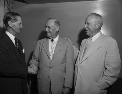 Chester S. Elliot, right, received congratulations Friday from F. L. Gordon on completion of a long career with the Southern Pacific Lines.