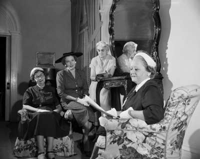Officers and directors of the Etta Newby Club, largest group in the Woman's Club have been busy during the summer preparing programs for the 1953-54 season. Among the chairmen assigned duties for special meetings are. left to right, Miss Irma Poindexter, music; Mrs. Stuckert Owens, decorations; Miss Guilla Phipps, reservations and Mrs. Sam F. Dugger, communications. The ladies can be seen seated in a living room, close to a mirror.