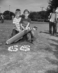 Tommy Roberts, 10, right, points to golf balls spelling out his qualifying score of 66 for nine holes, highest in meet. Teddy Calhoun, 9, who caddied for Tommy, looks on.