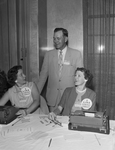 Jess Cariker, center, Odessa police chief and former Ellis County sheriff, registers at Hotel Texas Monday for the Sheriff's Association of Texas convention with Mrs. Libby Force, left, and Mrs. Vivian Crumpler of Fort Worth. Cariker is past president of the association.