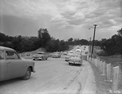 This photo shows first traffic to cross the temporary bridge that will be a detour route while West 7th Street Bridge is closed for repairs and work that will allow straightening of the Trinity River for the flood control program.