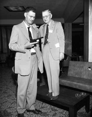 Sheriffs come in all sizes at the peace officer's convention at Fort Worth as indicated by Vriscoe County Sheriff Raymond K. Grewe of Silverton, left, who reaches 6 feet 6 inches, and Hidalgo County Sheriff E. E. Vickers of Edinburg, the top of whose head is 5 feet 5 inches above the ground. Grewe is holding a gun.