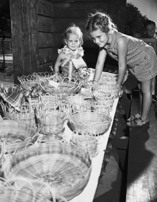 Jan Turner, right, 5-year-old daughter of Mr. and Mrs. Leon Turner of 2812 Forby, and Lynn Rogers, 3, daughter of Mr. and Mrs. Melvin Rogers of 2800 Bomar, have a look in Meadow Wood Park Tuesday at baskets made by children participating in the city recreation department's summer activities.