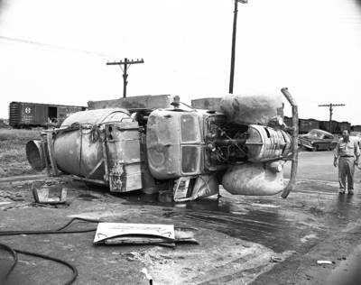 After this five-ton cement truck overturned in the 2600 block of 8th Avenue, Wednesday, the driver got a cup of coffee from a resident. Then he left. Police still were looking for the man at noon. There is an unidentified man at right.