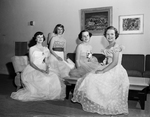 Young hostesses at a teen-age dance at River Crest Country Club recently were, left to right, Suzanne Smith, daughter of Mr. and Mrs. Bert K. Smith Junior; Suzanne Shugart; daughter of Mr. and Mrs. J. W. Shugart Junior; Elizabeth Milner, daughter of Mr. and Mrs. Harry Milner, and Sue Parsons, daughter of Mr. and Mrs. N. R. Parsons. Published in Fort Worth Star-Telegram morning edition May 10, 1950.