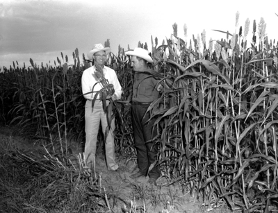 Billy Joe Gist, right, Taylor County farmer, and County Agent H. C. Stanley Jr. are shown in a field of good cane that later was put up in bundles by Gist, whose crops make a good comeback from almost total failure during dry 1952.
