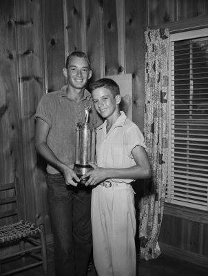 Finalists Ronnie Honeycutt, left, and Bill Eschenbrenner admire boys' trophy. Honeycutt won.