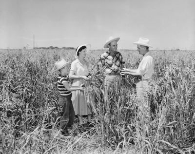 Farm and Ranch Yield - Joe C. Tinney, right, SCS work unit conservationist, with Jim and Fay Gill and nephew, Donnie Gersbach, 10, in field of Sudan on Gill ranch.