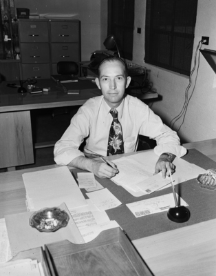 Steel braces, crutches and wheel chairs are clanking out a happy tune across the Kerrville County hills, as Texas' children with disabilities are learning to swim, hike, improve their skills, do things for themselves and learning to take their place in their communities. That was first year of operation for the camp and V. V. Vaughn was the camp director. Vaughn is shown sitting at a desk.