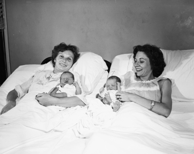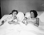 Mrs. Donald W. Rice (on left) of 803 N. W. 12th holds, John Raymond Rice. He was delivered by his father. There is an unidentified woman and baby at right.
