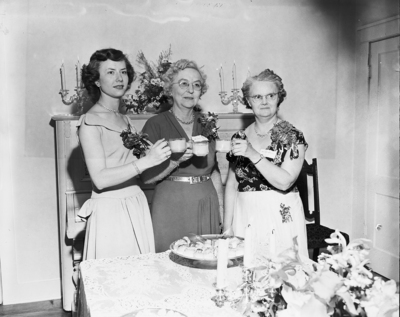Misses Barbara Whipple, left, and Mary Jones of Stephenville, were two graduating college girls among a group recently entertained at tea by the Fort Worth Chapter, AAUW, of which Mrs. H. R. Mundhenke, right, is president.