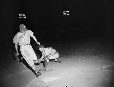 Catcher Jim Nolan of Jim Hill Produce team appears to be in agony as Refugio's Tex Aulds scores in 10th inning Monday night.